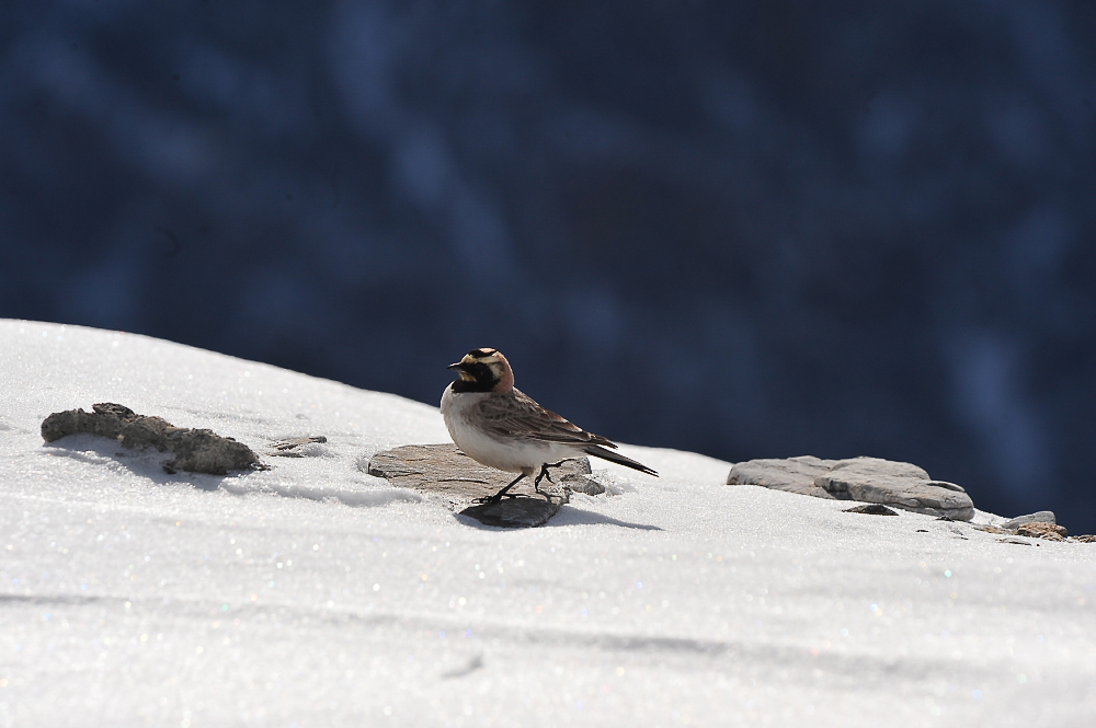 Έχει κιτρινόμαυρο κεφάλι και μακριά φτερά που σχηματίζουν μικρά στενά «κερατάκια» στο πάνω μέρος του. Τα δύο φύλα είναι παρόμοια, με το αρσενικό λίγο μεγαλύτερο, με πιο έντονο σχέδιο στο κεφάλι και πιο μακριά «κερατάκια». Στην Ευρώπη δεν θεωρείται κοινό είδος. Οι βόρειοι πληθυσμοί της είναι μεταναστευτικοί, ενώ οι νότιοι επιδημητικοί. Συναντάται σε αρκετά ελληνικά βουνά, φθάνοντας έως τον Ταΰγετο. Ζει, συνήθως πάνω από τα 2.000 m, ενώ τον χειμώνα κατεβαίνει λίγο πιο χαμηλά για να αποφύγει το πολύ χιόνι. Προτιμά την αλπική ζώνη, ιδιαιτέρως τα αλπικά και πετρώδη λιβάδια, όπου αναπαράγεται, φτιάχνοντας τη φωλιά της στο έδαφος. Τρέφεται με σπόρους και έντομα.